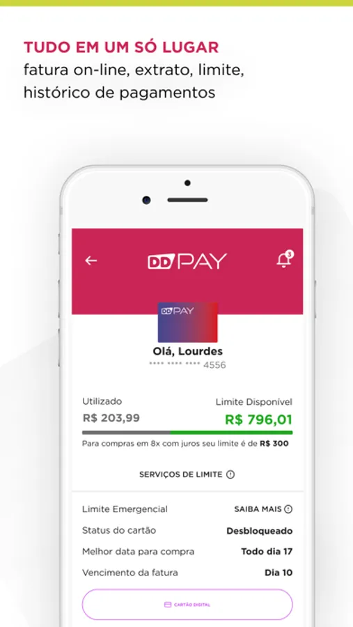 Com o aplicativo do Cartão DD Pay, você pode realizar compras, consultar seus limites, ver seu histórico de transações, controlar seus gastos, lembrar onde eles aconteceram, e ficar por dentro de promoções. Tudo isso de maneira prática e rápida.