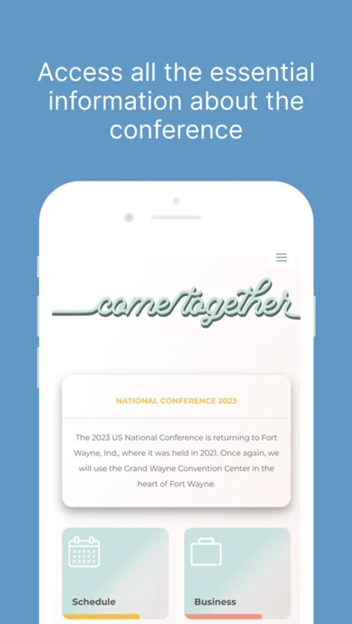 This is the official app for the United Brethren 2023 National Conference. Stay connected to the conference through direct access to the schedule, business content, and real-time updates. The 2023 US National Conference is returning to Fort Wayne, Ind., where it was held in 2021. Once again, we will use the Grand Wayne Convention Center in the heart of Fort Wayne.