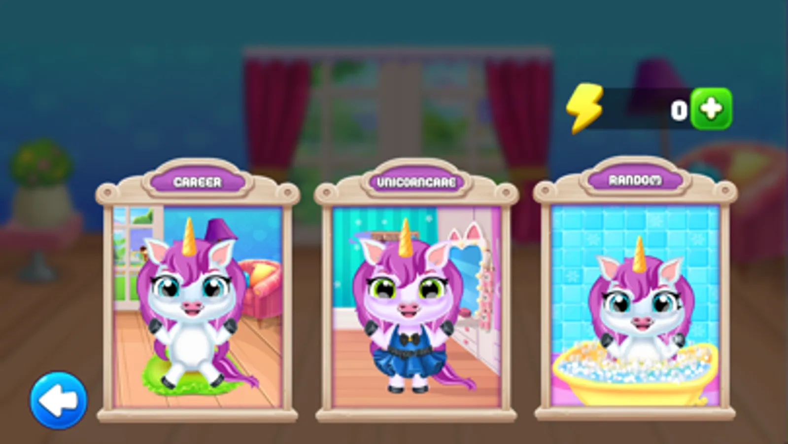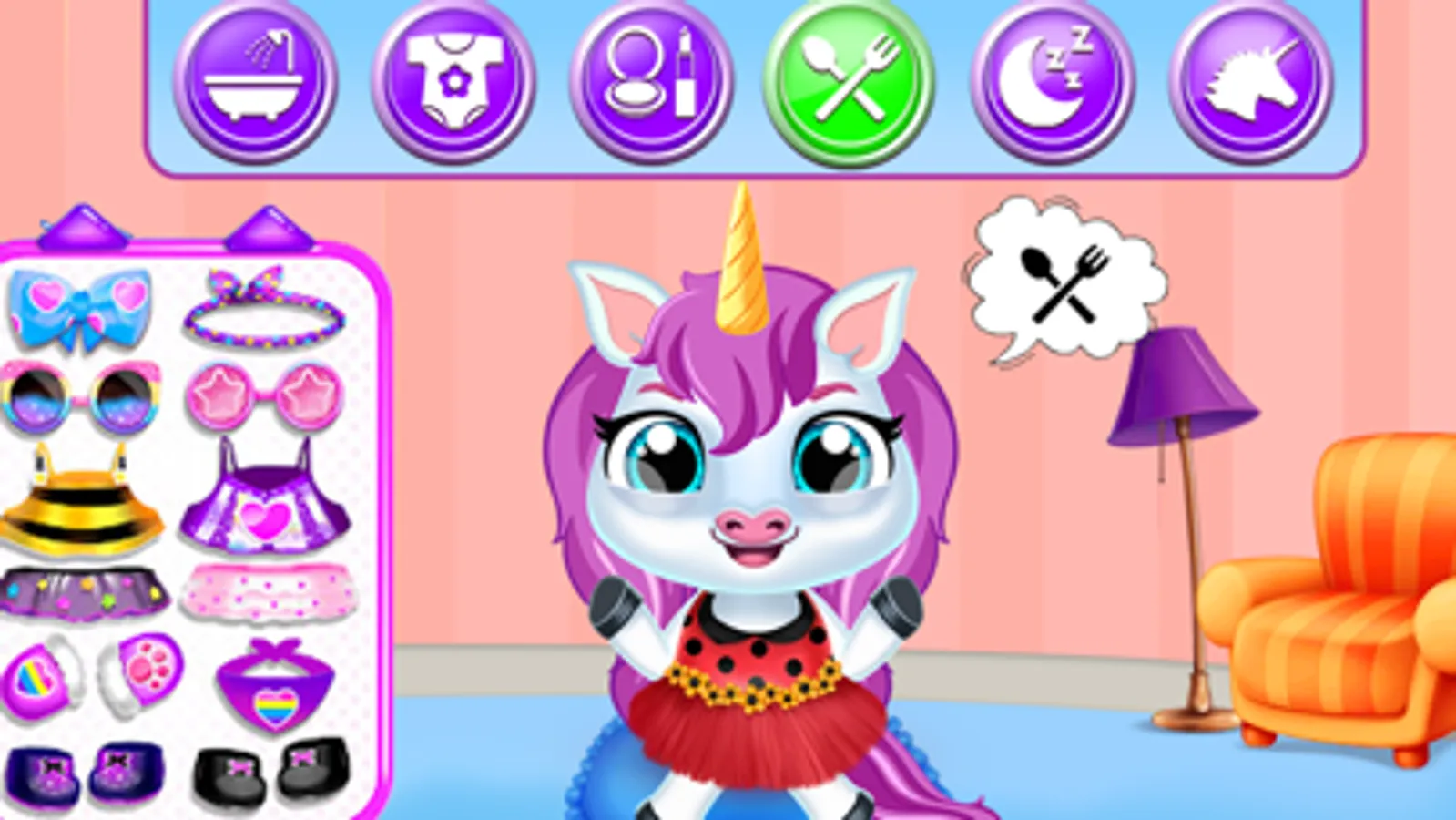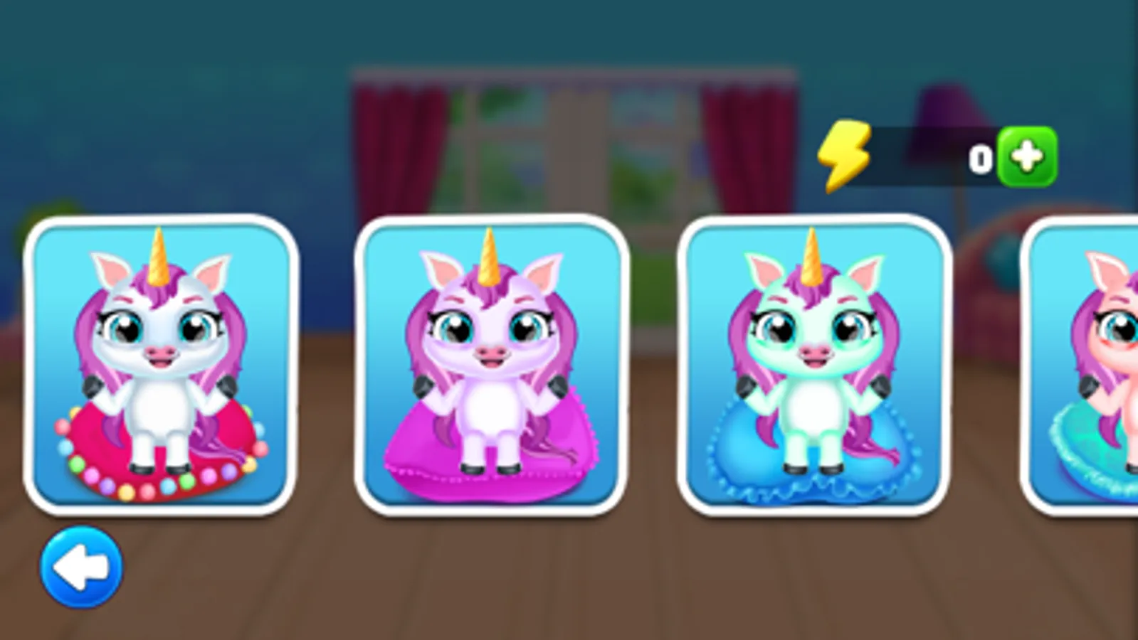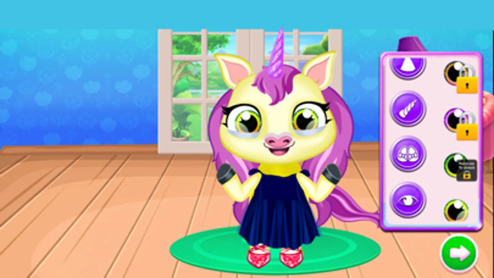Feed and take care of Pet in this unicorn games for free, and watch it grow. Play Games in the Game Room and collect rewards Try out new Outfits in baby unicorn, Hats and Eyeglasses. Customize each room's Wallpaper. Unlock Achievements and Special items in this baby unicorn dress up game. Visit and play with your friends. Talk to pet is helps you to release your stress in baby unicorn games.
