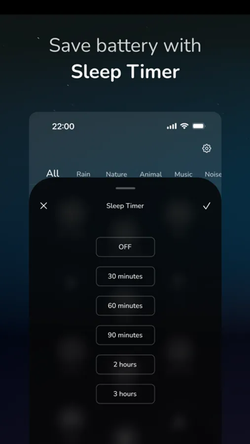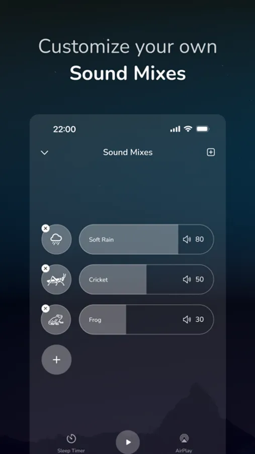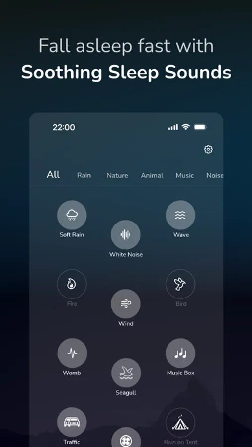 ● Selecting certain sounds, such as train, airplane, and beach, so that you can quickly fall asleep in a familiar environment.