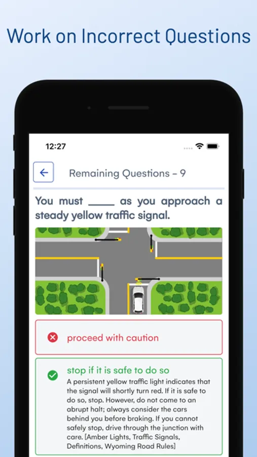 Our Wyoming WY Driver Test Permit app , is easy to use and accessible from anywhere, on any device. You can practice on your phone, tablet, at home or on the go. And with our free and unlimited tests, you can practice as many times as you need to feel comfortable and confident for the real DMV Written test .