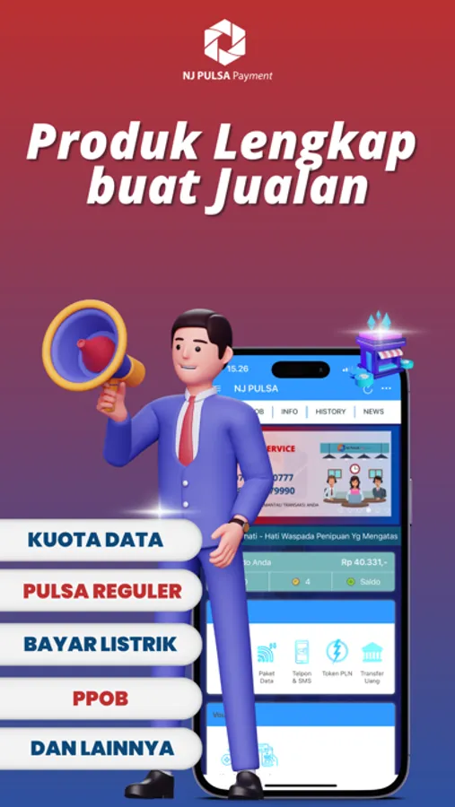 NJ PULSA adalah solusi bagi anda yang ingin berbisnis Pulsa,Paket Data, Token PLN, Voucher Data, Voucher Game, dan PPOB dengan Harga bersaing, bisa untuk dijual lagi atau pakai sendiri.