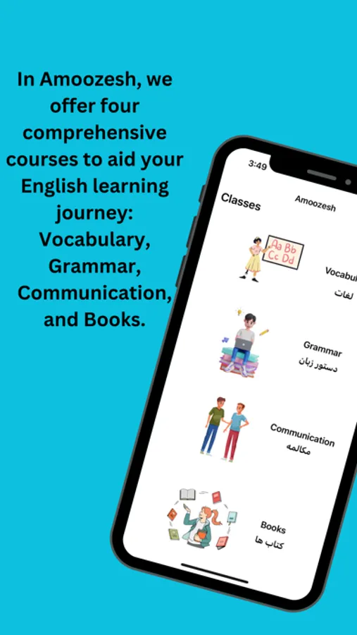 Amoozesh is an innovative educational application designed to empower Afghan women by teaching them English through Persian, their native language. It consists of four comprehensive sections: Vocabulary, Communication, Grammar, and Books.