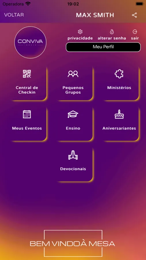 - No item Meu Perfil é possível atualizar seus dados cadastrais na Igreja;