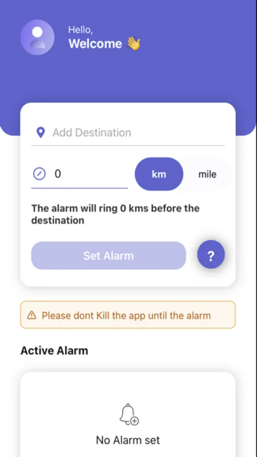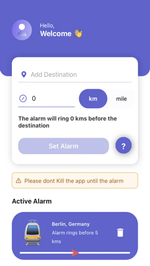 2. Choose your distance: Enter the number of kilometers or miles before which you want the alarm to ring.