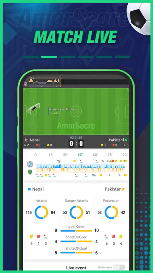 AmorScore includes a huge amount of match data, including scores, goals, red and yellow cards, h2h, match schedules, live animations, team and player stats and other important data in real time for the Champions League, Europa League, English Premier League, Spanish LaLiga, German Bundesliga, Italian Serie A, French Ligue 1 and more.