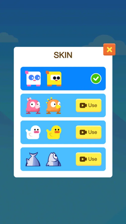 Moreover, we've added an exciting skin-changing feature! Now you can take on challenges with different characters! There are 4 adorable character sets, including Super Bros, Happy Chick, Stacky Bird, and Chill Fish Bros. Want to give it a try?