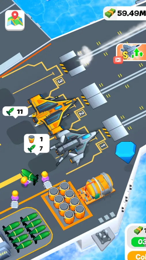 Buy the first runway and the first plane for your aircraft carrier. Let the plane perform the task. Completing the task can provide you with a renovation point. Continuously expand your aircraft carrier with the transformation point until he becomes the biggest one.