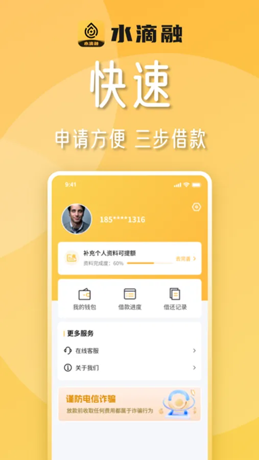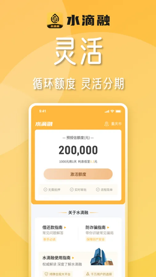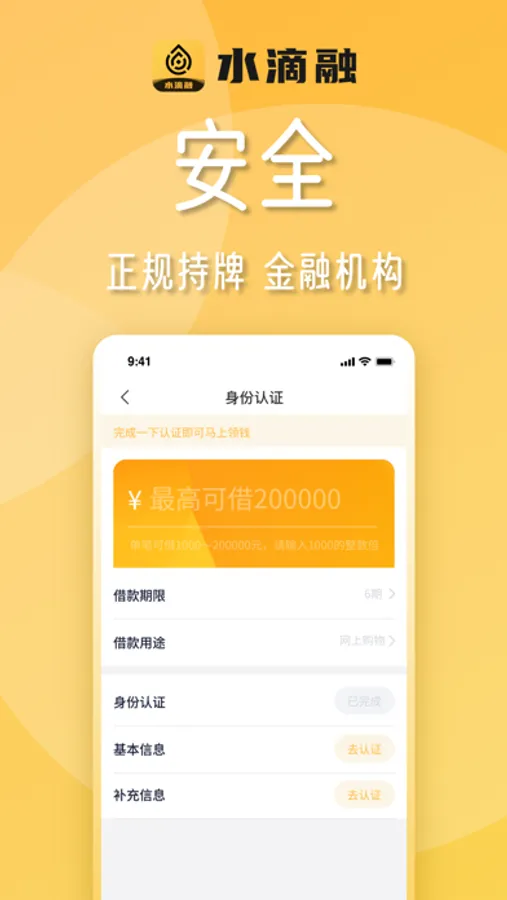 水滴融是一款信用贷款借钱app,凭身份证+手机即可快速贷款的小额贷款平台,无抵押无担保,5分钟快速借款,APP线上申请无需面签,放款率高达90%轻松三步借钱1000~50000元,分期还款申请0-36个月,额度高至20万!