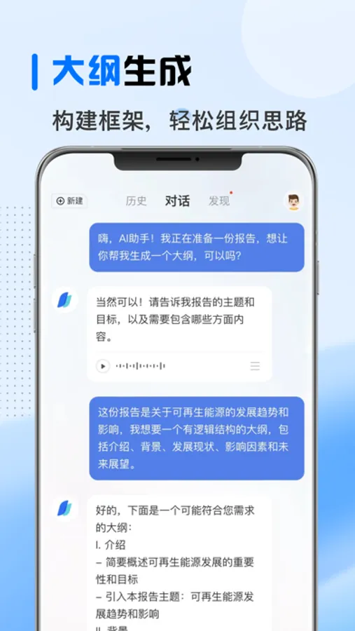 AI 4.0智能助手能够智能生成文稿大纲,帮助您在写作之前规划结构,确保思路清晰有序。不论是文章、报告还是演讲稿,AI助手都能为您提供优秀的大纲框架,助您更高效地进行文稿创作。