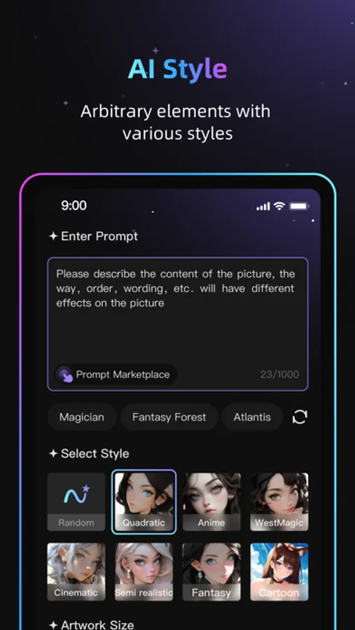 Our app regularly adds new styles for you to try out, providing endless possibilities for discovering new representations of your ideas and artistic needs. With our AI art generator, you'll always find something new to explore and create.