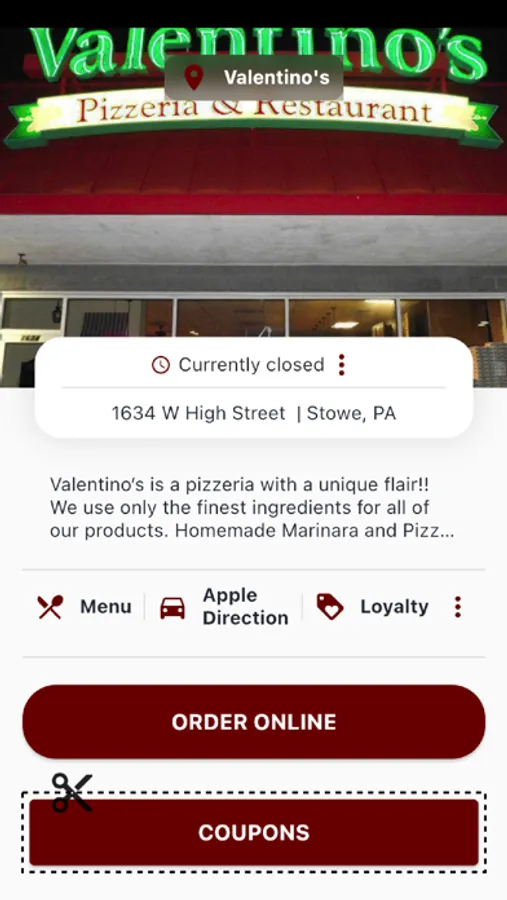 Valentinos Pizzeria Stowe is restaurant app has many different functions. It contains an online ordering link, restaurant images, address and driving directions, store hours, menus, and many other great features.