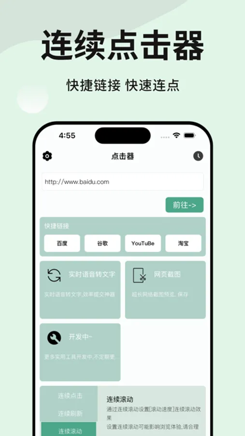 无论是游戏攻击还是繁琐的工作任务,无需再让手指疲惫。《智能连点器》是你提高效率的必备工具!通过连续点击功能,轻松完成重复点击任务;通过自动滚动功能,省去手动滑动屏幕的麻烦;通过自动刷新功能,第一时间获取最新资讯。更令人惊喜的是,实时语音转文本功能让你告别打字困扰,轻松将语音转化为文字。无论是游戏、社交媒体浏览、新闻阅读还是工作办公,我们都为你提供了极致的便利和效率。立即下载《智能连点器》,让点击更智能,让你的生活更轻松!