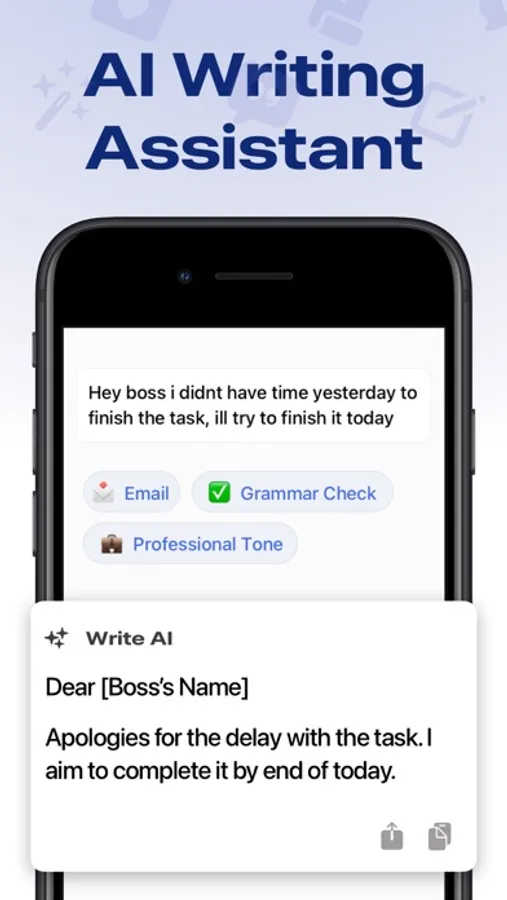 Unleash the power of AI in your everyday writing with Write AI! Designed to cater to writers, social media enthusiasts, professionals, and anyone in need of impeccable text, our app offers a unique blend of features to elevate your writing game.