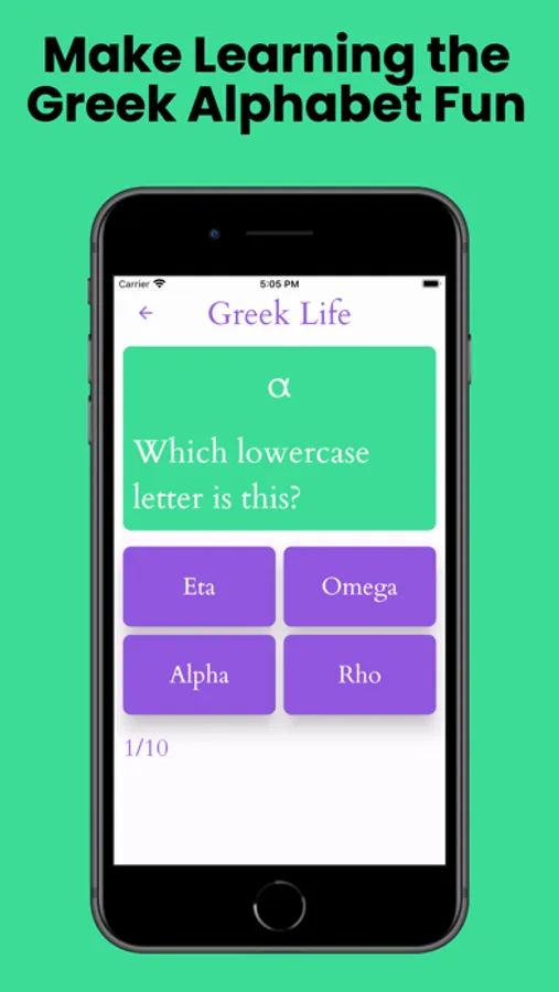 Learn the greek alphabet through this engaging trivia game. Play the game I wish I would have had during college.