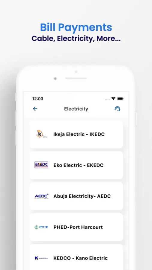 - Electricity Bill Payments (Prepaid/Postpaid): Abuja Electricity(AEDC), EKEDC (EKO), KEDCO (KANO), PHED, JOS Electricity, IKEJA ELECTRIC, Ibadan Electricity, EEDC, Benin Electricity