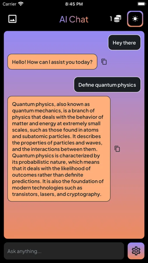 1. Easy Image Generation: Create stunning images with just a few taps. AI Image & ChatBot makes image generation a breeze, allowing you to effortlessly transform your ideas into visually captivating artworks. Simply input your preferences or keywords, and let our advanced AI algorithms do the rest.