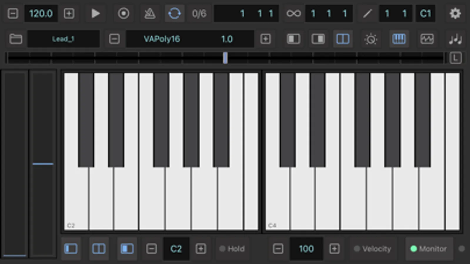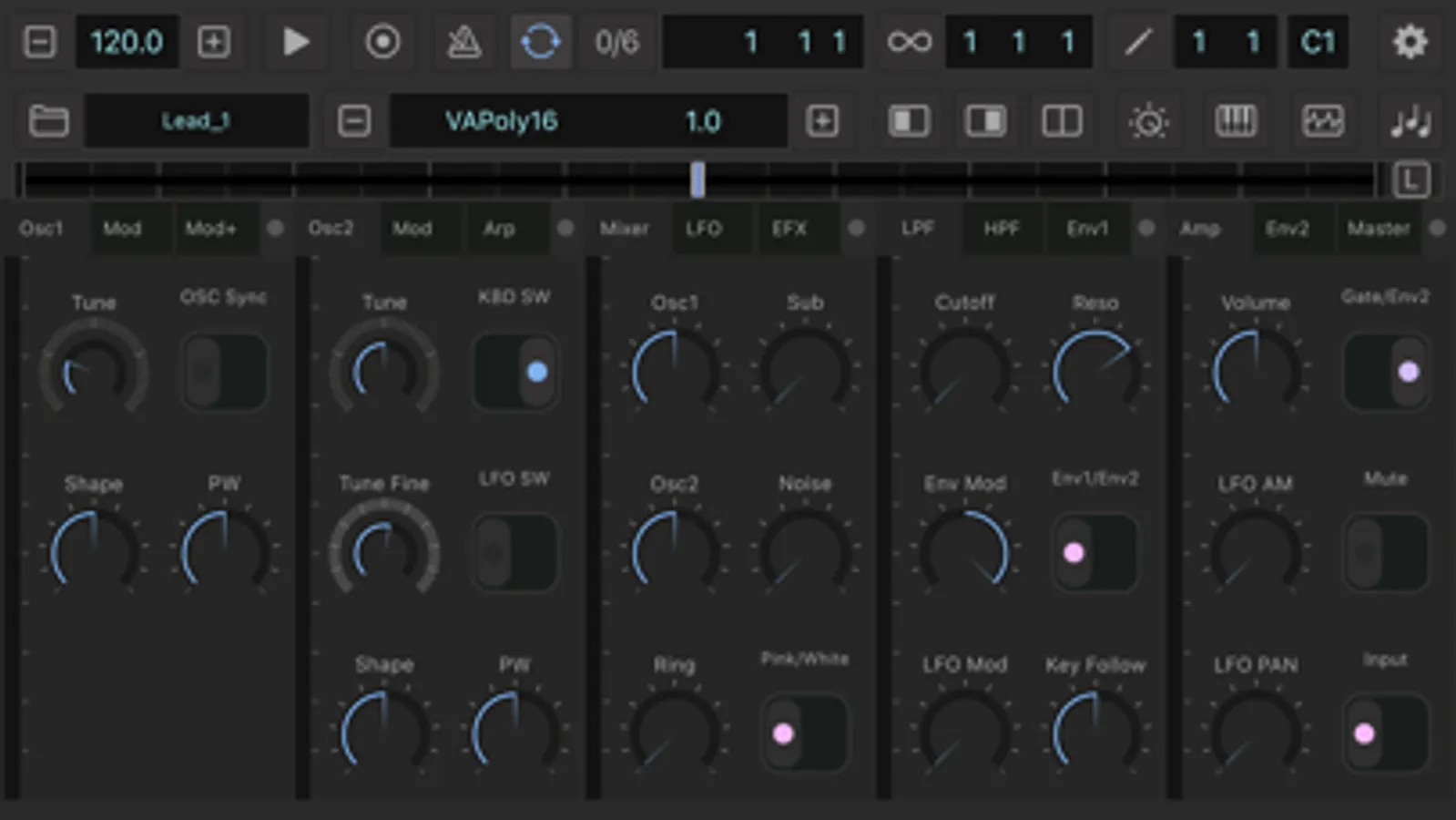 The synthesizer consists of two 8 voice synthesizer, which features two oscillators, two ADSR envelopes, resonant high pass and low pass filter and an amplifier per voice. The oscillators features continuously variable wave shape and wide variety of modulation. The filters are modeled on the Sallen-Key filter circuit for classic analog sound. The Effects include delay, chorus, flanger, reverb, eq and compressor. The sequencer features piano roll and automation editor to program 16 bar pattern per clip. Project files can be saved in iCloud Drive, so that the project can be accessed from iPhone, iPad or Mac.