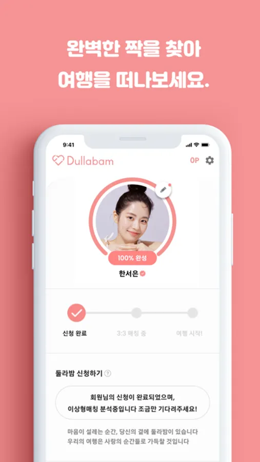 둘라밤은 기존의 데이트 어플과 차별화된 3:3 매칭 시스템으로 2박3일의 여행을 통해 서로를 알아갈 수 있는 신개념 데이팅 앱입니다.