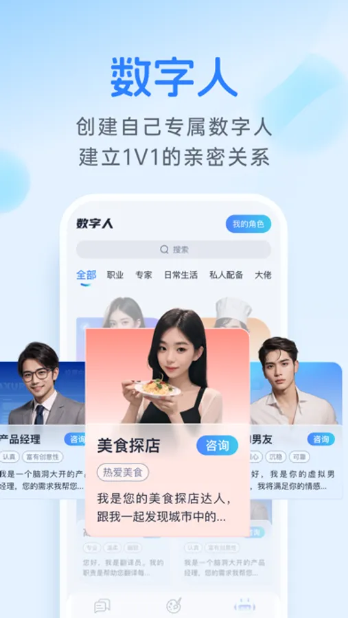 虚拟数字人陪你每一天,千言ai可以生成您的AI女友,AI男友,AI闺蜜,每个人都可以建立1V1的专属亲密关系。