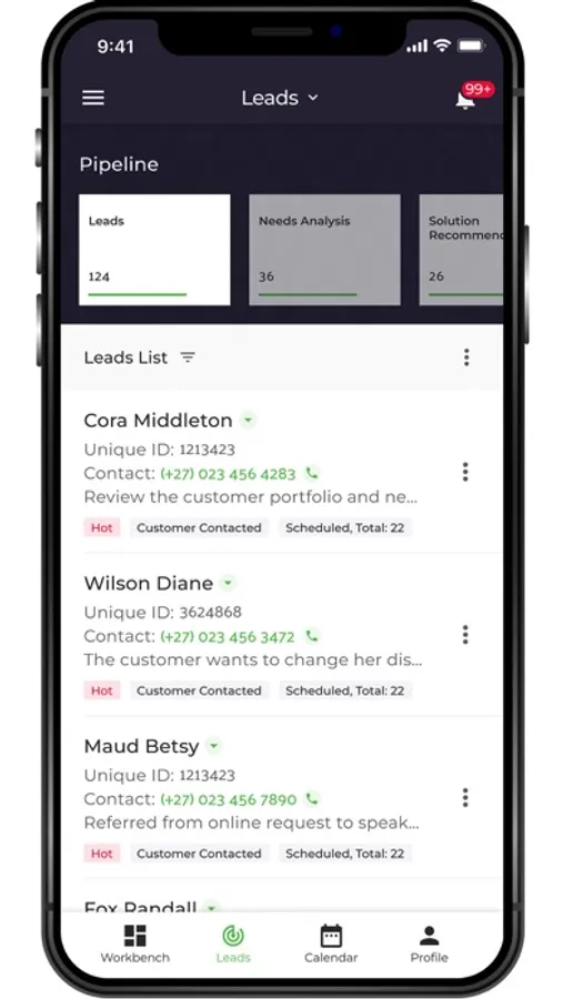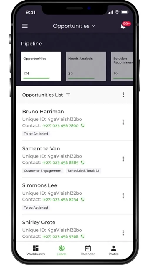 You can also view and manage your diary, access leads and opportunities, and track your interactions.