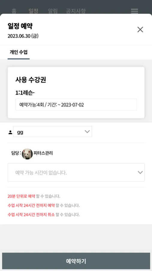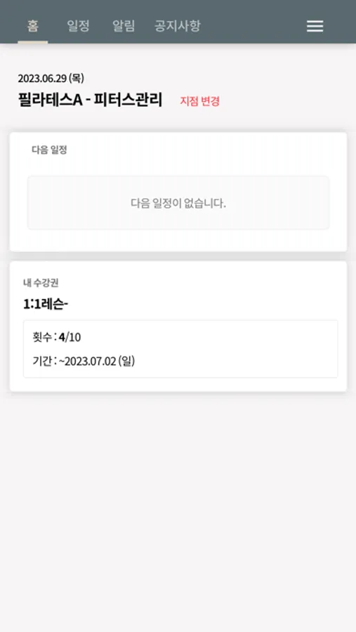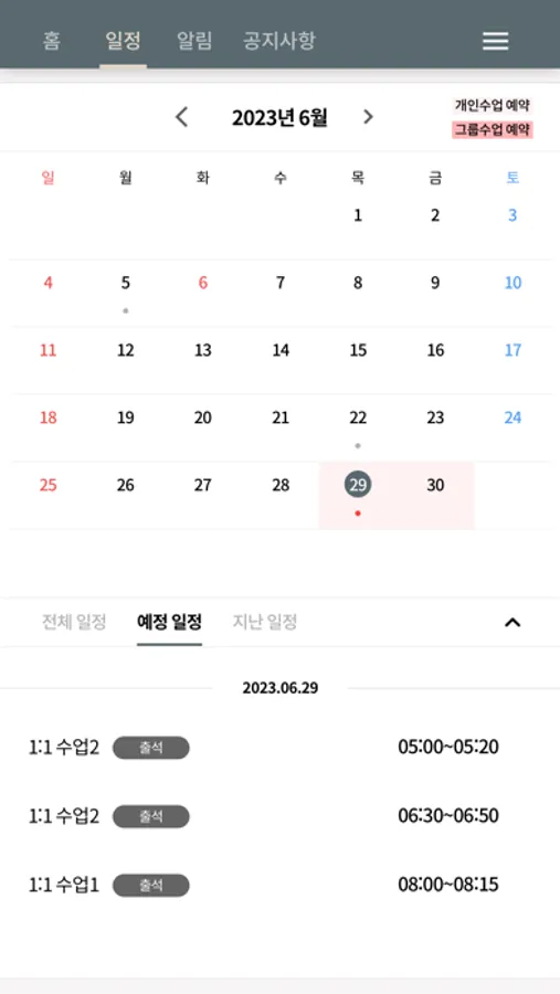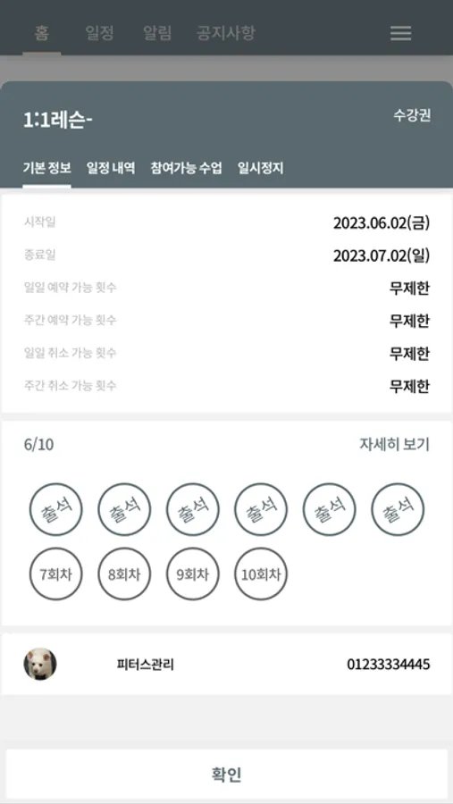 등록된 레슨 내역 및 수강 정보, 공지사항을 확인할 수 있습니다.