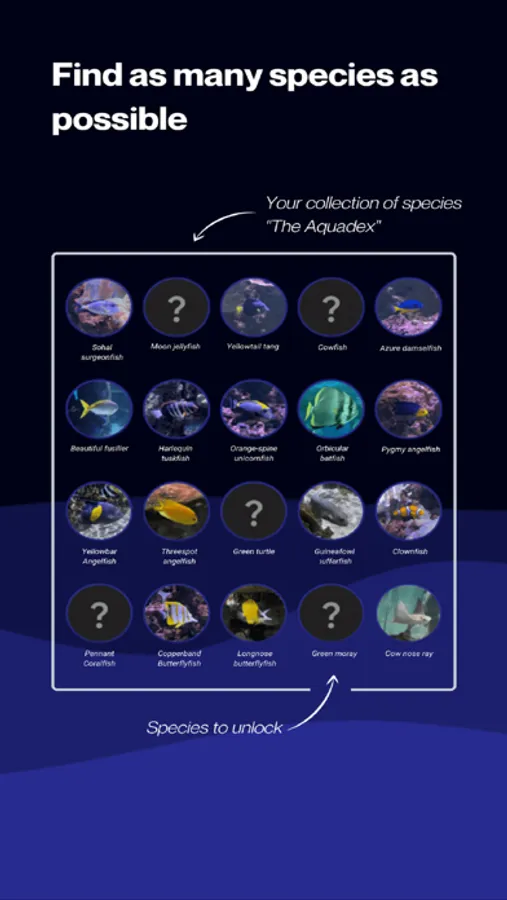 Löydä mahdollisimman monta lajia täydentämällä lajikokoelmaasi, Aquadexia, ja suorita tehtäviä vierailun aikana.