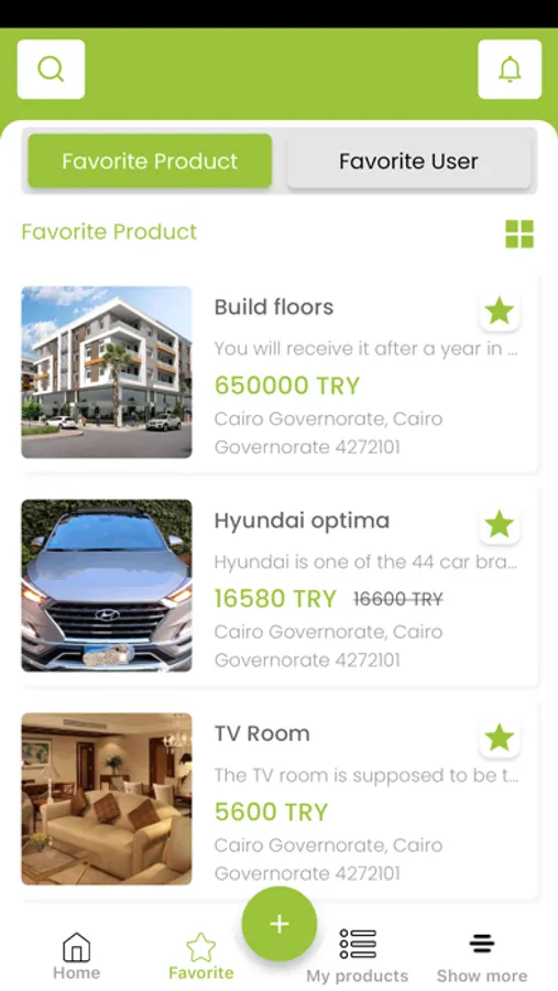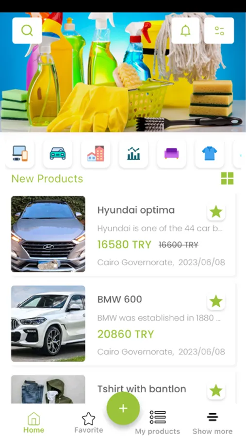 In this application, the user can add his own products that appear on the My Products page, and he can see the products of other users on the home page, and he can see the product details and add it to the favorites, and he can also add users to the favorites, and he can share the product, and he can modify the products And he can filter the products, for example, by distance, or by price, or by name, etc.