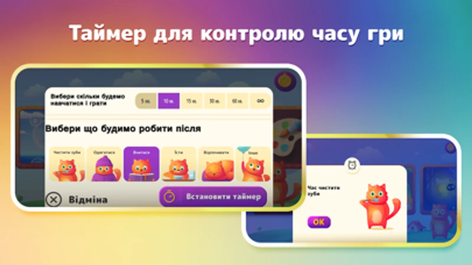 Додаток має простий і зрозумілий для дітей інтерфейс, а також звуковий супровід, що дозволяє дитині самостійно проводити час. Також, є таймер, який обмежує час з додатком і мотивує дитину робити повсякденні справи, наприклад чистити зуби, їсти, та багато іншого.
