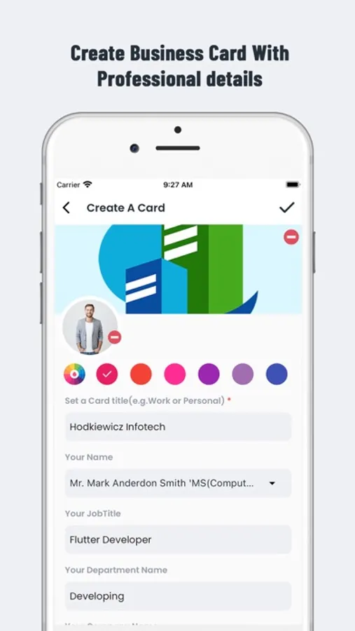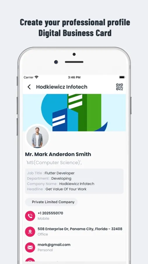 - Create your professional profile using Digital Business Card and easy to scan and share and save as contact
