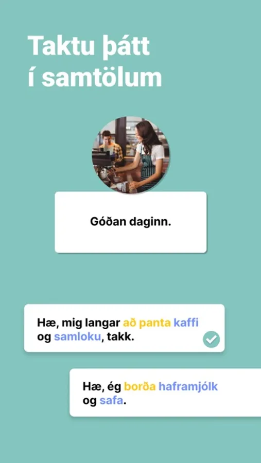 With this solution, users can practice conversations in a safe environment. The application can listen to users speak, exercise them in pronunciation, and offer feedback in real time. Included in the app are general courses and work-specific courses, tailored for each company. With Bara tala, you can practice Icelandic wherever and whenever.