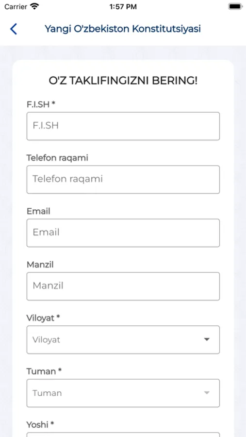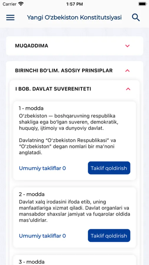 Qonunchilikni yangi tahrirdagi Konstitutsiyaga muvofiqlashtirish hamda uni amalga oshirishda yuzaga kelayotgan muammolarni bartaraf etish bo‘yicha takliflarni taqdim etish platformasi.