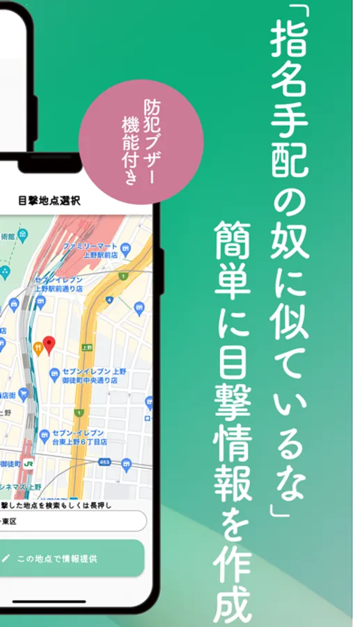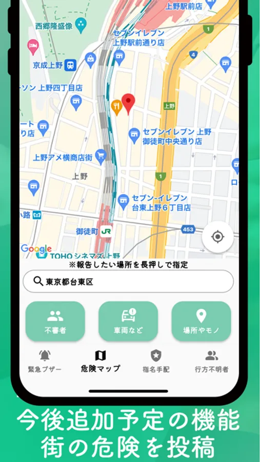 * 危険マップ:地域内の危険地点を登録・共有できる機能です。不審者情報や危険運転、危険な場所などを地図上で確認することができます。