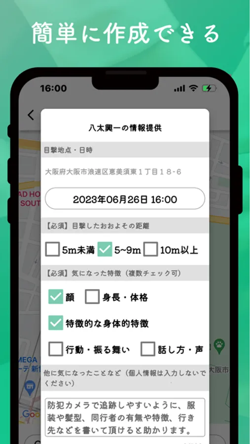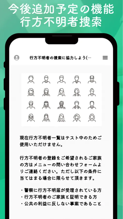 * 行方不明者情報:行方不明者の情報を集め、共有することができる機能です。家族や友人が行方不明になった際に、その人物の特徴や最後に目撃された場所を登録することで、多くの人々が情報共有に参加し、早期の発見に繋がる可能性を高めます。