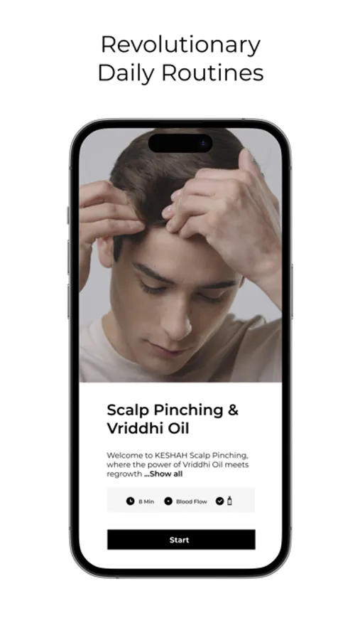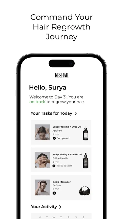 Our app is designed to integrate seamlessly with the KESHAH Black Kit, unlocking an empowering pathway to hair restoration. Your daily routines, powered by our potent products - Ojus Oil, Vriddhi Oil, and a specialized Scalp Massager, become a revolution in just 20 minutes a day. This scientifically validated regimen, harnessed by the app, holds the key to hair regrowth.