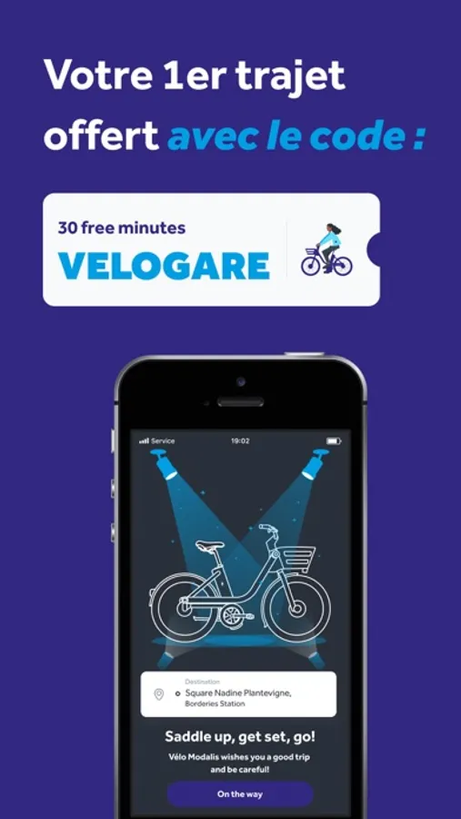 Take control of an electric bicycle with the code VELOGARE and enjoy 30 minutes for free on your first ride.