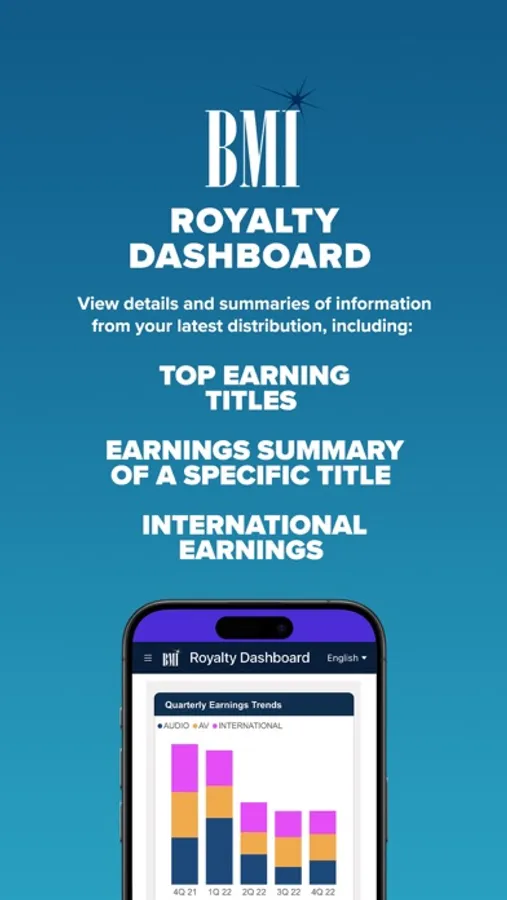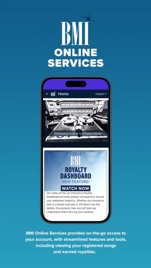 BMI Online Services provides on-the-go access to your account, with streamlined features and tools to manage all your needs, including viewing your registered songs and earned royalties.