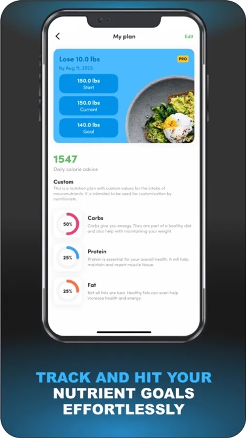 Personalized nutrition plan with macro and calorie targets calculated based on your goals.