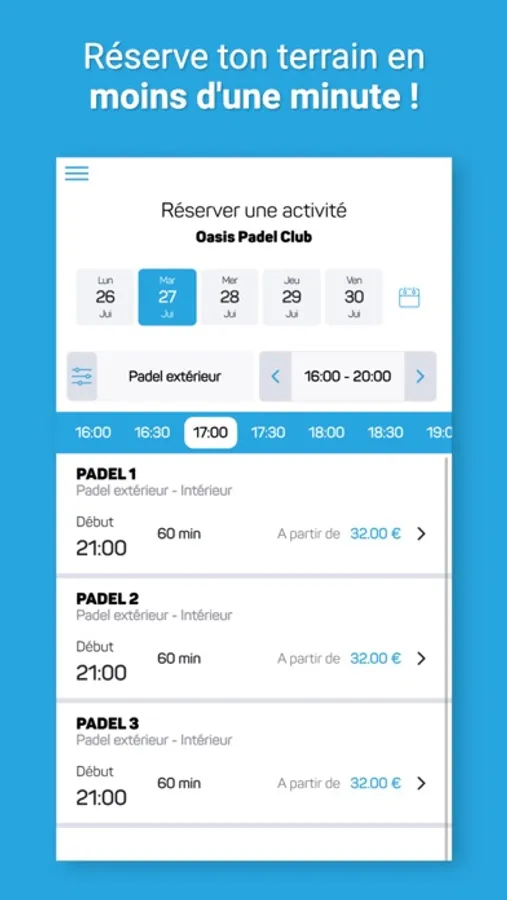 Fini la corvée de réservation ! Avec l'application tu n'as plus qu'à accéder aux créneaux disponibles et à en choisir un. Le club recevra alors automatiquement ta réservation.