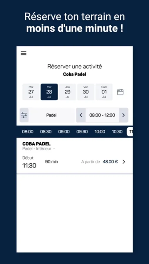 Fini la corvée de réservation ! Avec l'application tu n'as plus qu'à accéder aux créneaux disponibles et à en choisir un. Le club recevra alors automatiquement ta réservation.