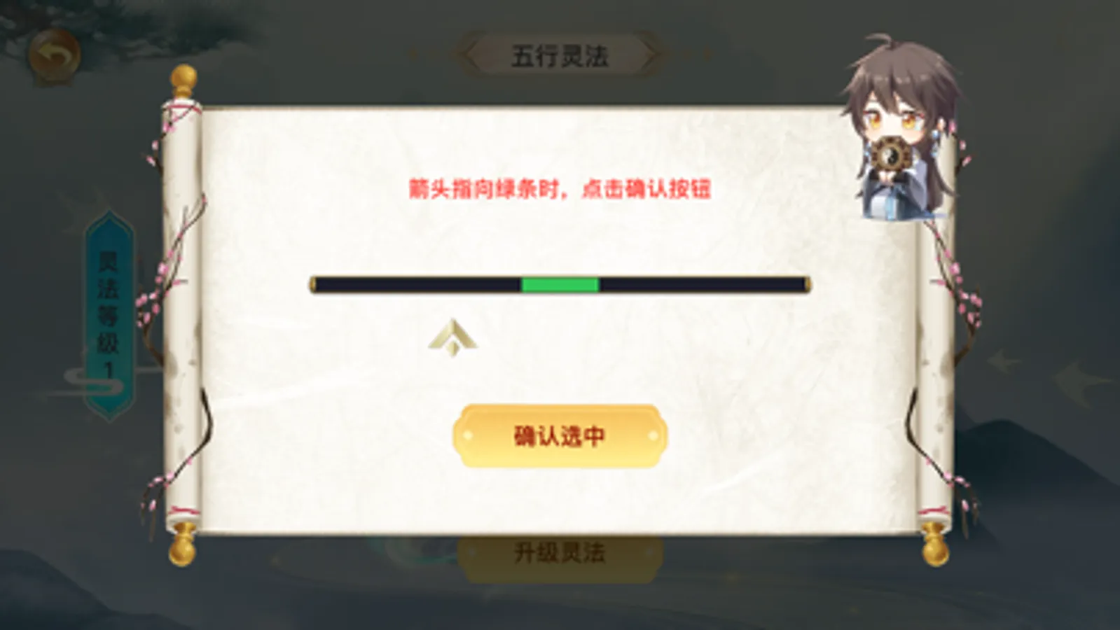 控制箭头选中位置,升级灵法,提升角色战力。