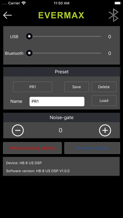 In the main screen you will find the Input Source menu where you can choose BT, HI-LEV, USB and AUX. Here you also find 8 Presets (saved into your device) to choose from, you access the Music Player, you have the Main and Subwoofer Volume, and the Advanced menu with Channels, EQ, System and Mixing.