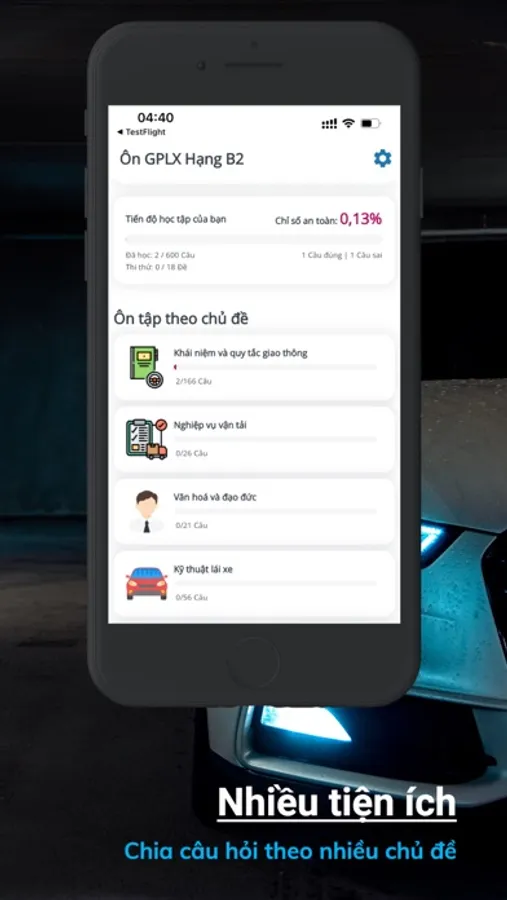 - Ôn tập theo các chủ đề: câu hỏi điểm liệt; khái niệm và quy tắc; nghiệp vụ vận tải; văn hóa và đạo đức lái xe; kỹ thuật lái xe; cấu tạo và sửa chữa; biển báo đường bộ; sa hình.