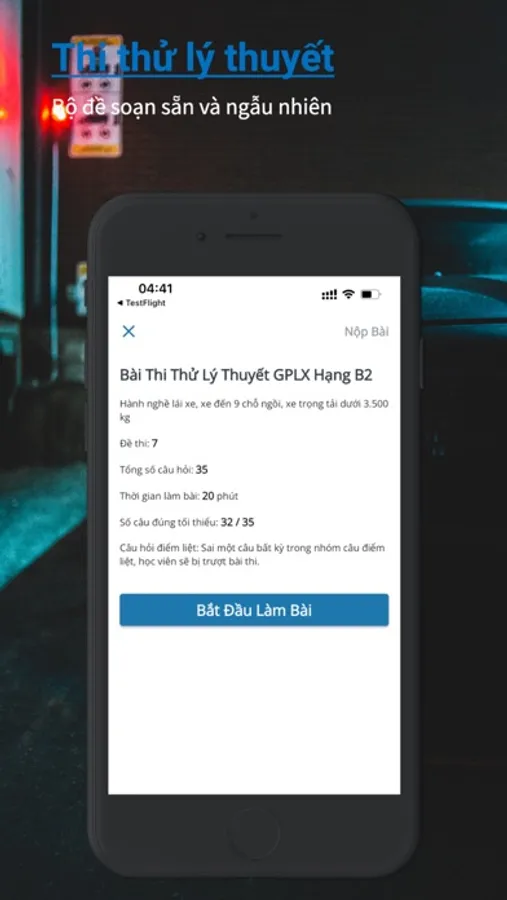 - Thi thử lý thuyết với bộ đề có sẵn hoặc ngẫu nhiên theo cấu trúc ra đề của Bộ Giao Thông Vận Tải, cho các loại bằng lái xe máy A1, A2, A3, A4; và ô tô B1, B2, C, D, E và F.
