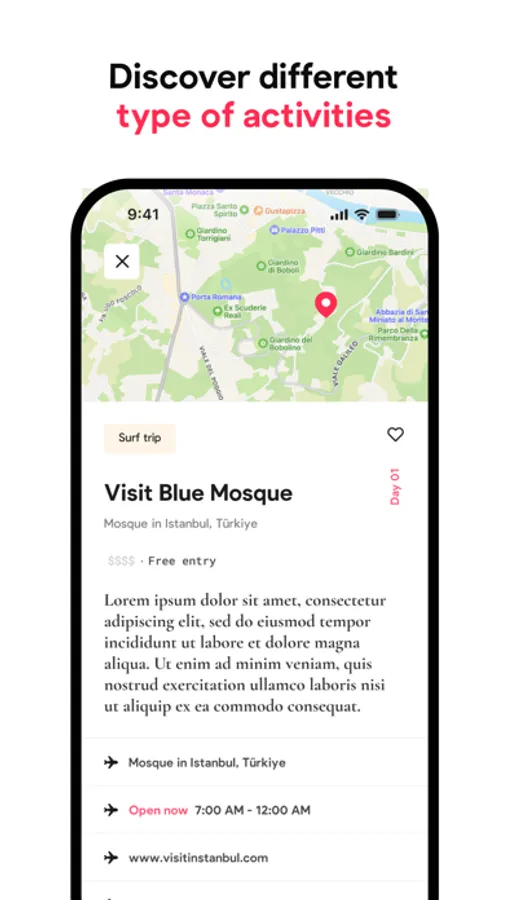 3.Activities can be of different kinds, from cultural visits to bus/taxi travel to where to eat and what to do in the evening. Each activity will have a description that will include prices, particular alerts, location, etc.
