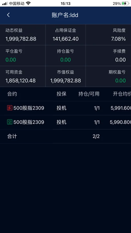 2.账号信息:随时掌握账号下详细信息,权益、持仓、预警线、强平线。