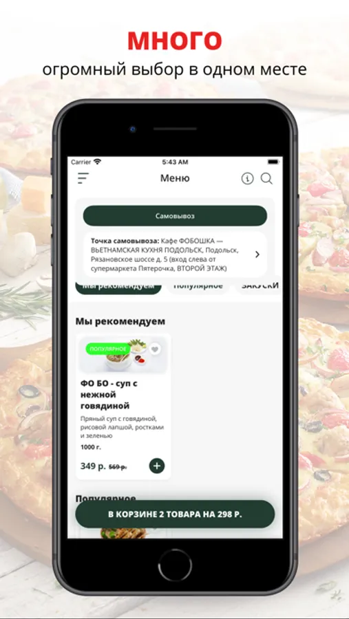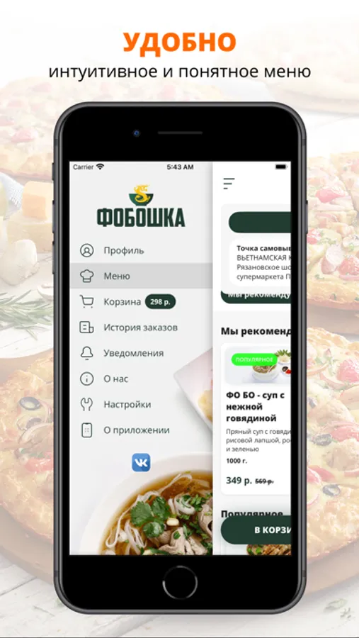 Удобное приложением для заказа еды «Фобошка». Закажите самовывоз или доставку по городам Подольск, Щербинка, Силикатнаяй