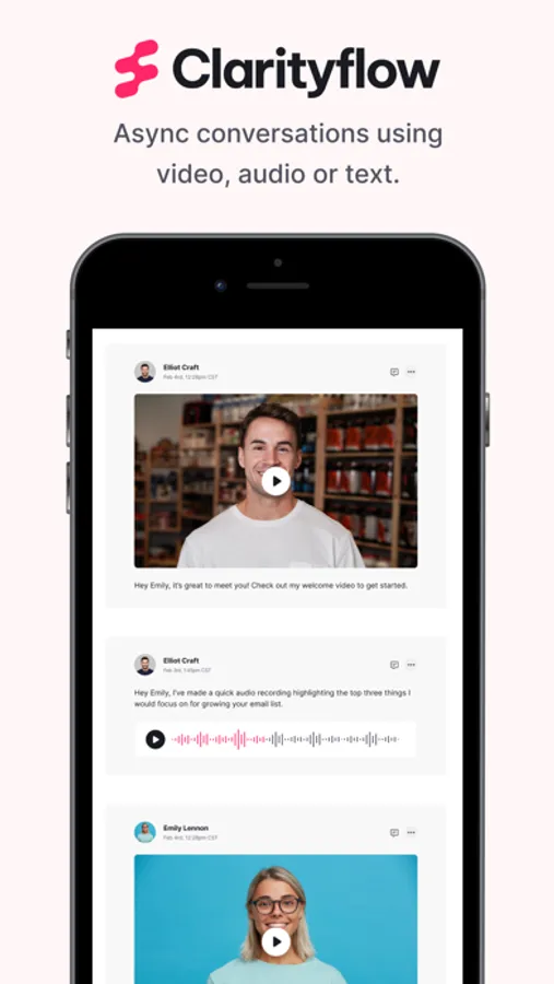 Introducing the Clarityflow iOS app - your companion for seamless and productive asynchronous communication. With the power of Clarityflow at your fingertips, you and your clients can effortlessly exchange video, audio, or text messages, no matter where you are. Our intuitive threaded conversation view ensures every interaction is neatly organized, enabling you to trace your communication history with ease.
