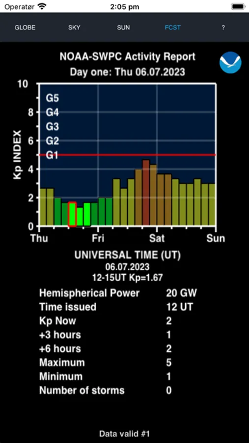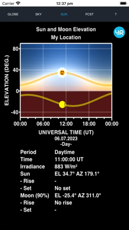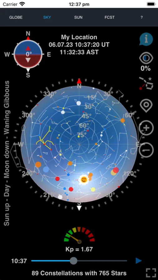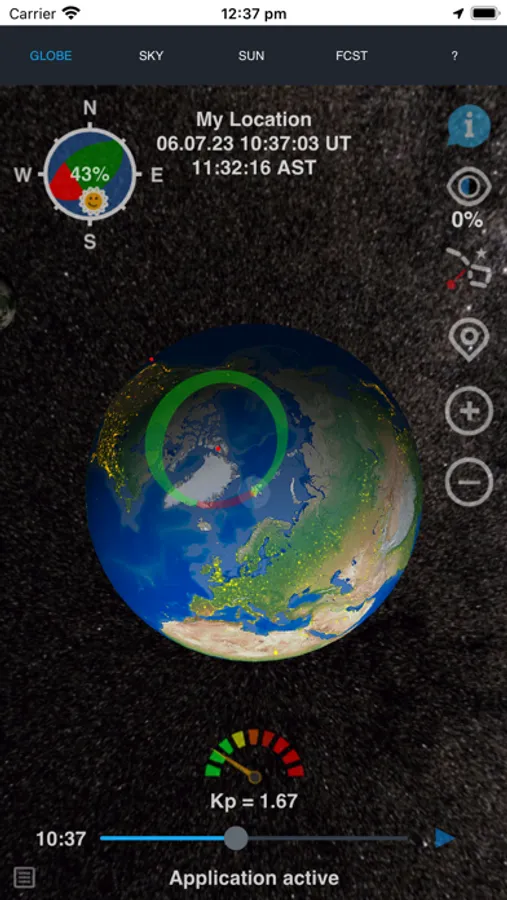 It renders the Earth in 3D with rotation and scaling at your fingertips. The Sun illuminates the globe as it updates every second. The auroral forecasts are up to 3 days ahead in time. The Sky module shows a fish-eye view of the sky including the predicted position of the auroral ovals, planets and stars as seen from any ground point location. On selected targets like the Sun, the Moon, or any planet, a fly-by-rocket mode is enabled for space travel to get a closer look at the target.
