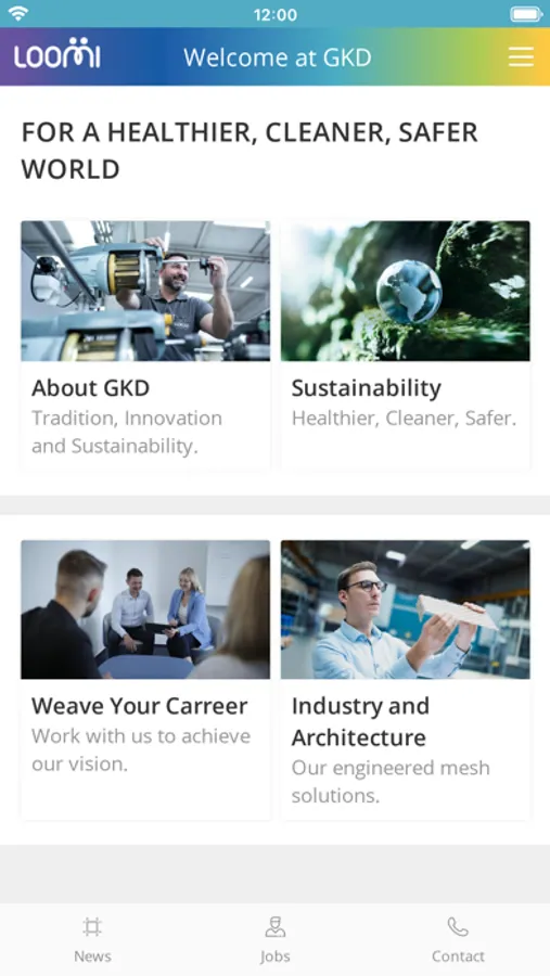 A connecting App. Loomi is the digital loom of the GKD Group and an integral part of an innovative, global production platform. This is where the Living Mesh is woven. In other words, this app offers - for the first time in the history of the GKD Group - all the relevant news, information and interactions within and about the company. Users get access to push notifications, a calendar, as well as location information via Maps and much more. Thus, employees, applicants, customers, partners and other interested parties can find out about GKD's worldwide activities at any time and from anywhere.